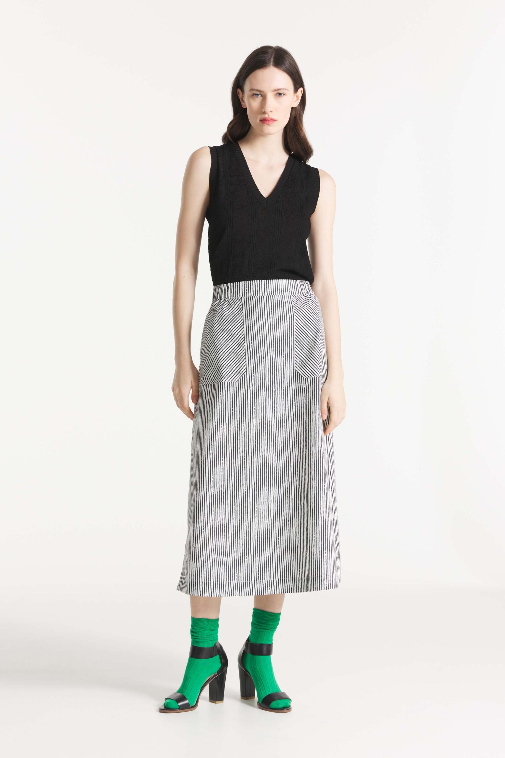Cette jupe présente une coupe évasée, longue et une taille élastiquée. Nous vous recommandons de prendre votre taille habituelle pour un ajustement optimal.
