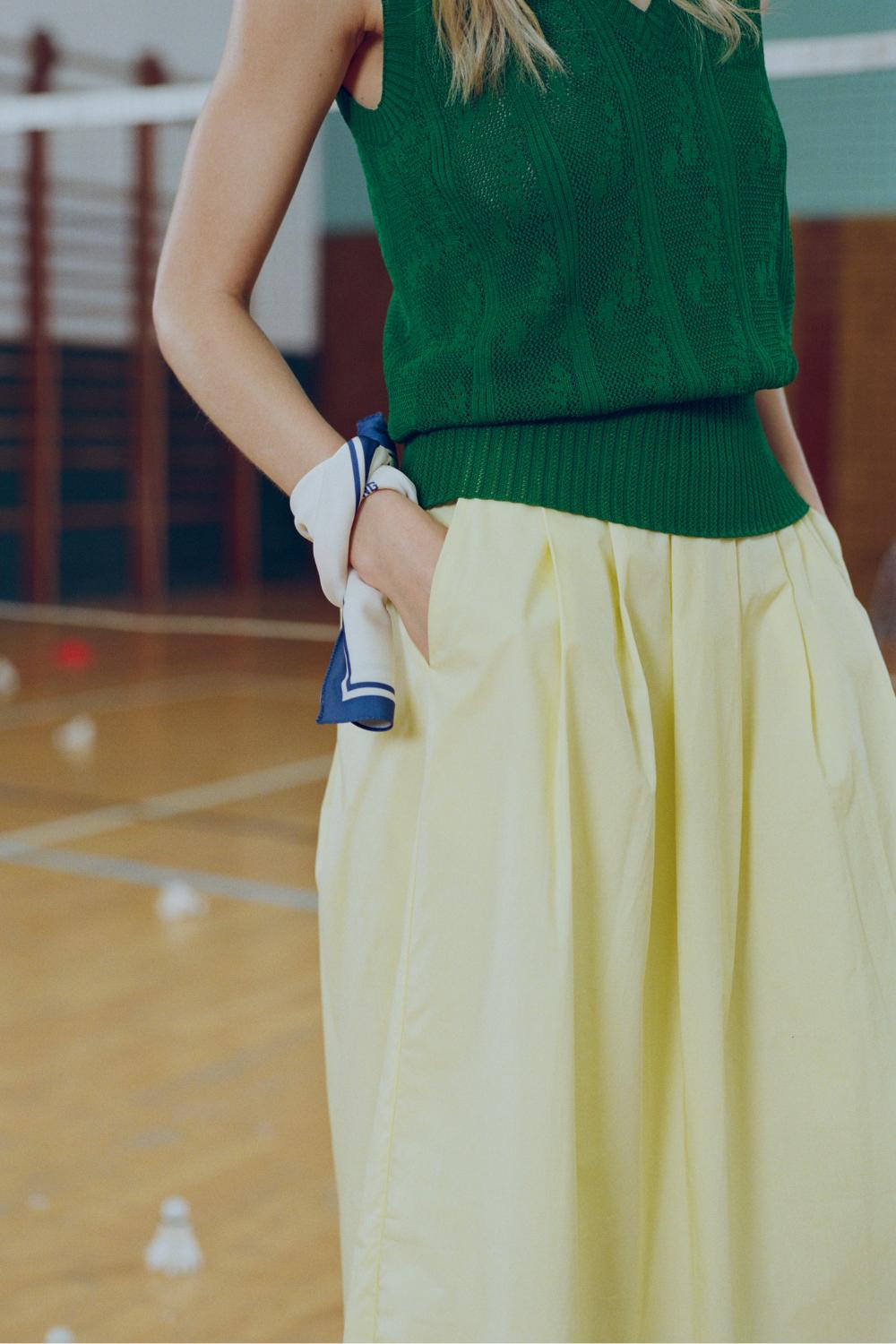 La jupe Jopeli est une pièce élégante réalisée dans une popeline de coton légère, dotée d'une taille élastiquée. Longue et ample, elle met en avant le travail soigné du plissé. Ses deux poches à l'italienne ajoutent une touche à la fois pratique et sophistiquée.
