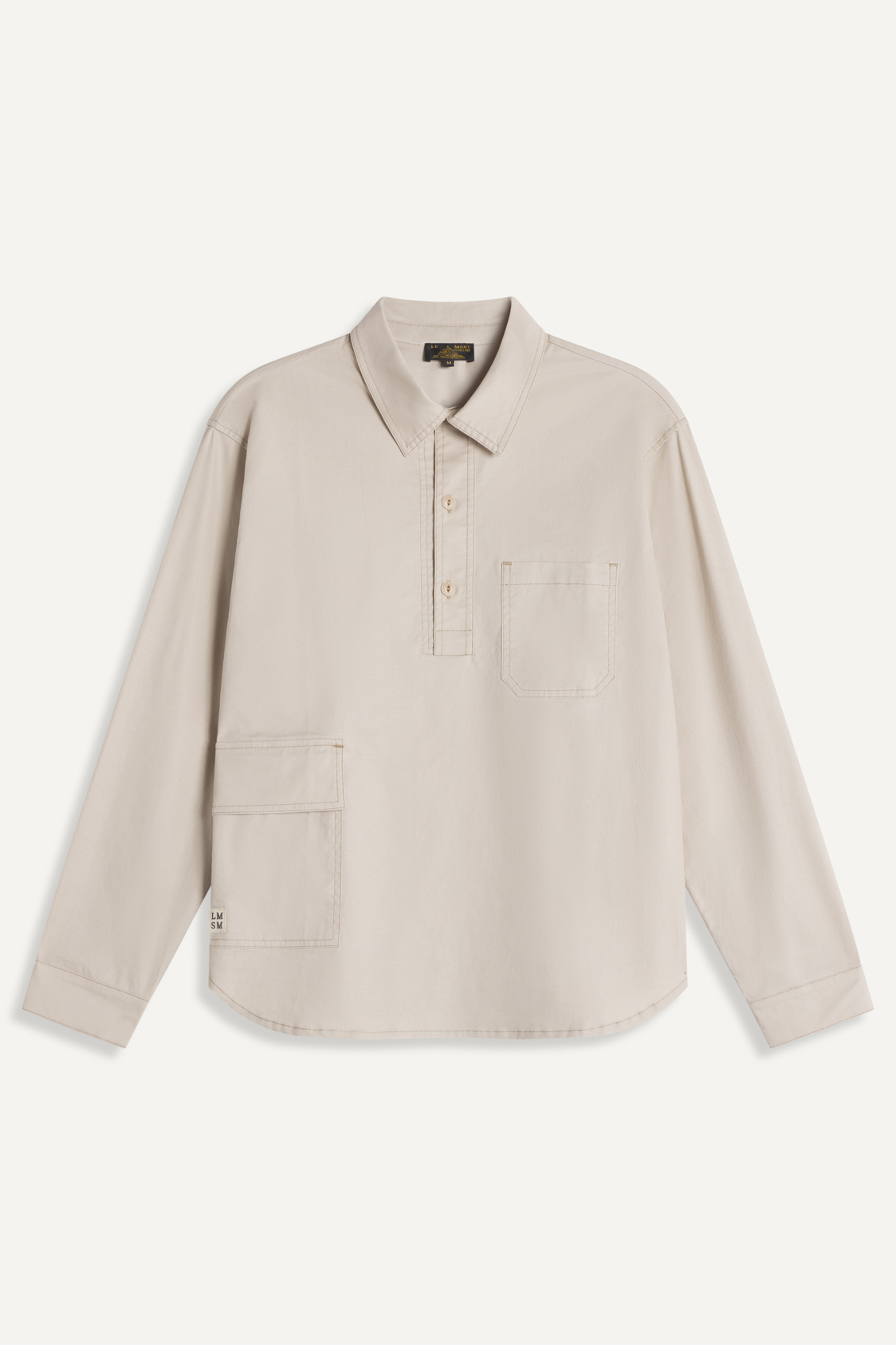Cajun is a long-sleeved shirt with asymmetrical pockets, contrast stitching and a Tunisian collar. It features a half-opening with maxi flap pocket extending into the back. Made in Portugal from a Spanish weave.